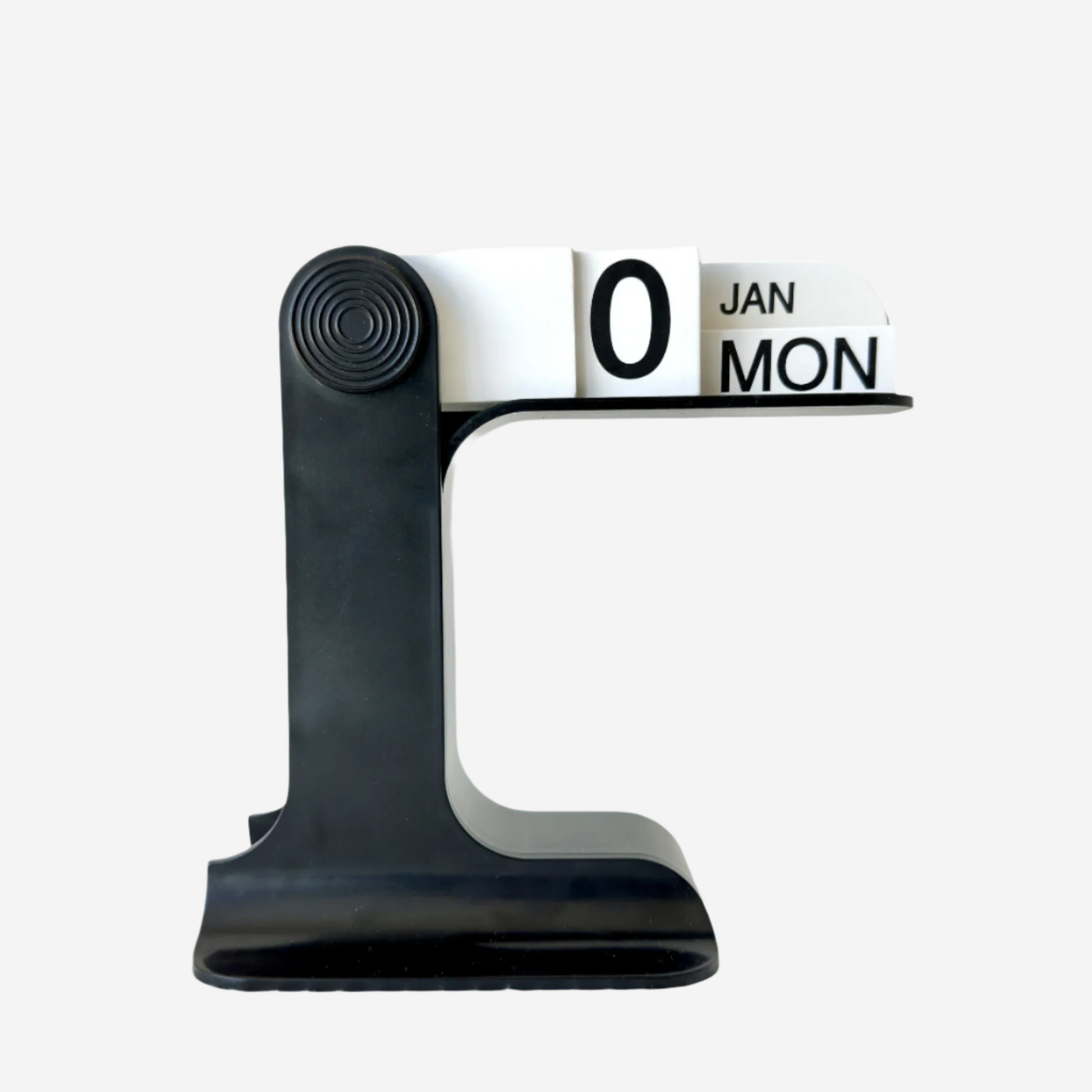 The Perpetual Calendar is a modern, reusable desk accessory designed for year-round use. Featuring a striking black or white color scheme, it has a distinctive L-shaped frame with a matte finish and rounded corners, giving it a contemporary look that suits any workspace or home office.
